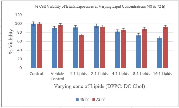 Figure 2: A) Characterization of Liposomal Formulations (Blank, Passive Loading=PL & Active Loading= AL), B) Mass Transfer, Loading Capacity and Entrapment Efficiency of CIP free base and CIP HCl using Passive Loading (PL) method in 1:10 ratio of drug: lipid, C) D) & E) Physical Stability of Liquid Liposomal Formulations at 4°C, over 15 days