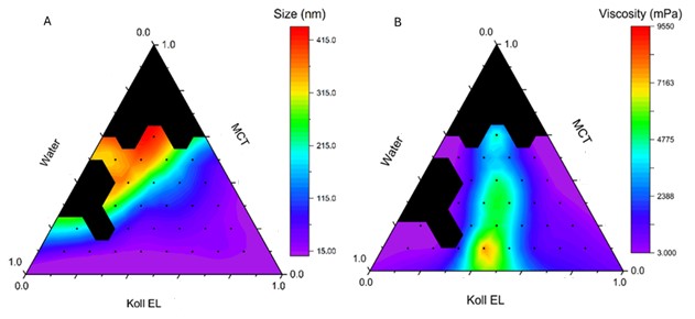 Figure 1. Ternary diagrams of mean droplet size (A) and viscosity (B) of KEs. The black regions indicate data points representing phase-separated formulations.