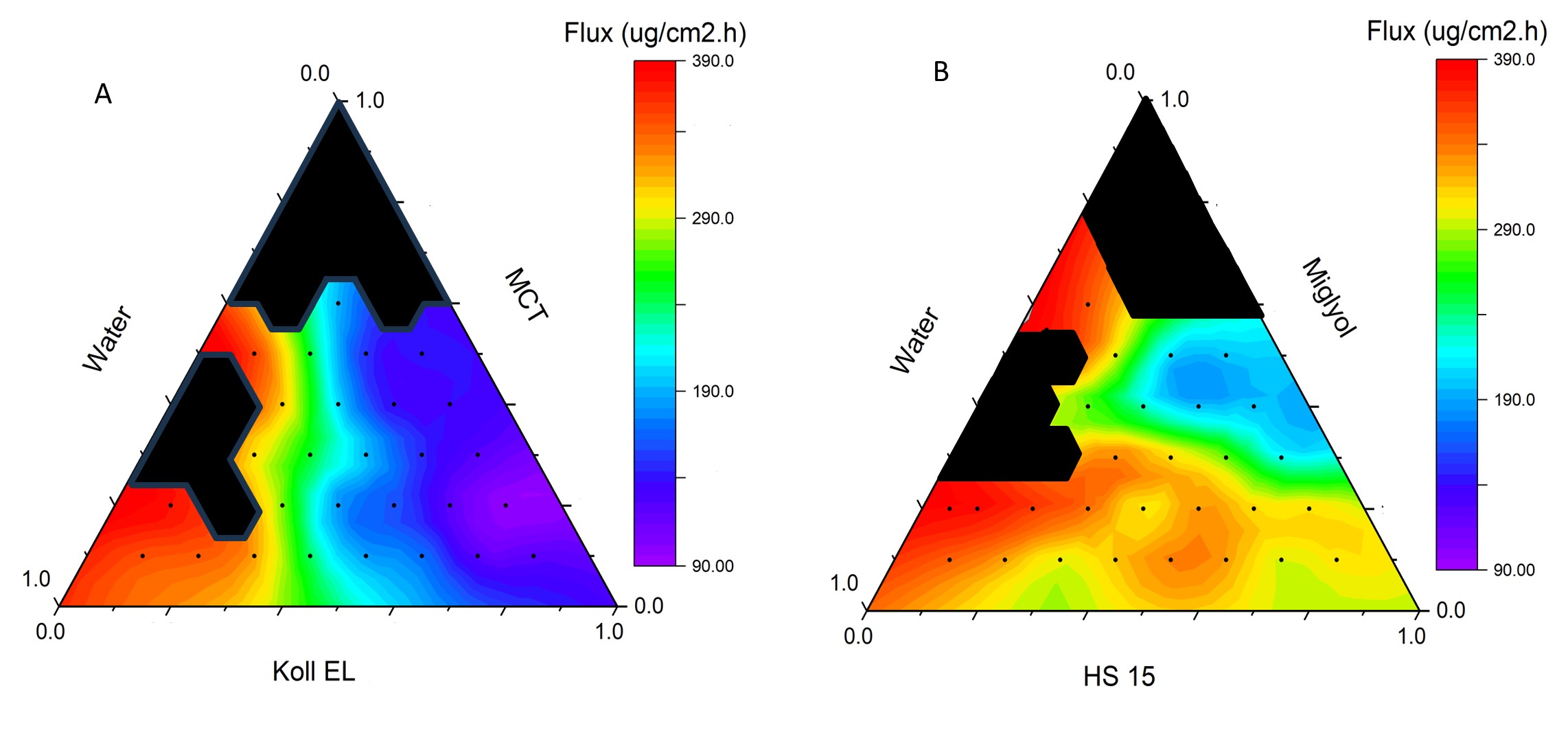 Figure 2. Ternary diagrams of permeation profiles of KEs (A) and HSEs (B). Each data point shows the average flux of triplicated permeation results. The black regions indicate data points representing phase-separated formulations.