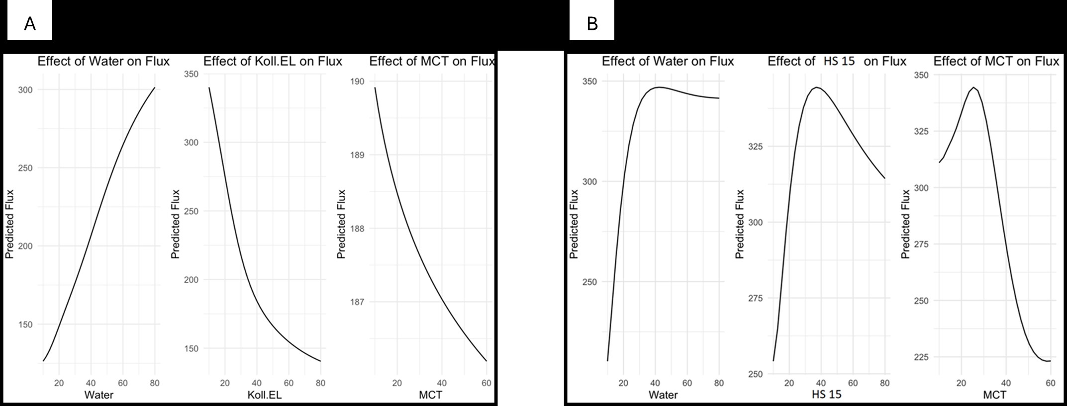 Figure 3. Partial dependence plots for water, MCT, and surfactants, Kolliphor EL (A) and HS 15 (B), on flux