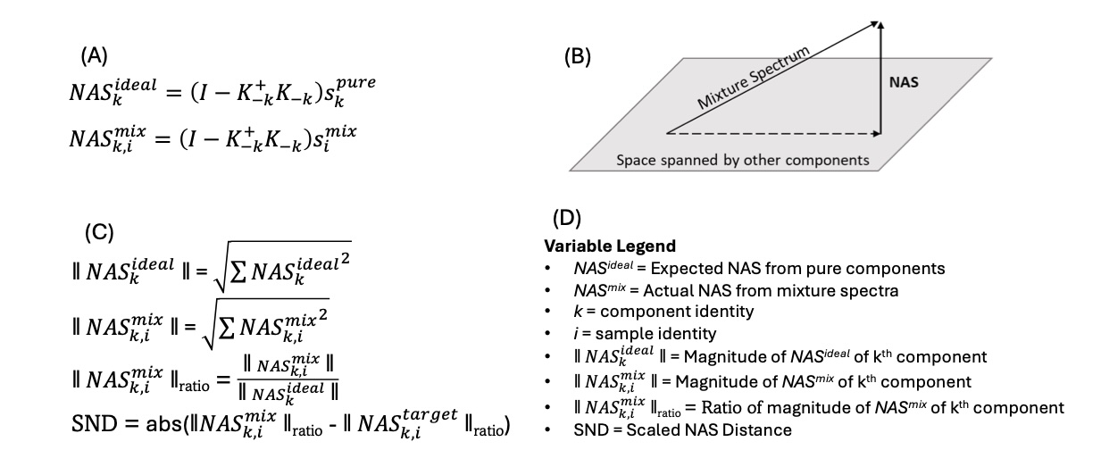 (A) Calculation of NAS vector for pure component and mixture spectra, (B) Illustration of NAS vector relative to other signals,[5] (C) Calculation for SND, (D) Variable legends.