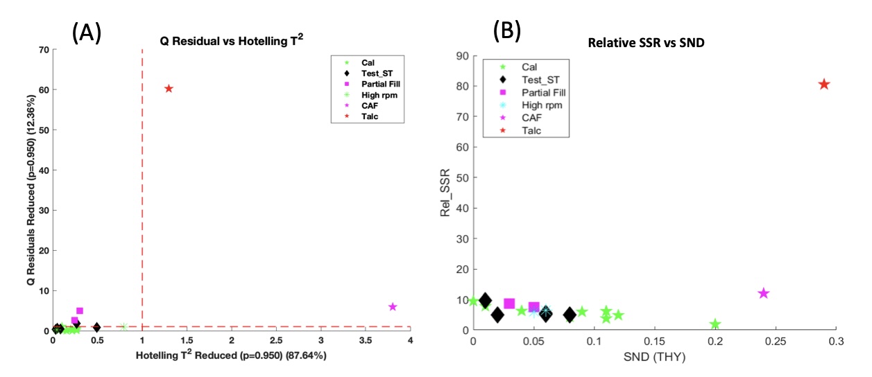 (A) Q-residual vs Hotelling’s T2 distribution for PLS model with 2 latent variables. Spectra were preprocessed with SavGol (5 Points, 2nd order, 2nd derivative + mean centering). (B) Relative SSR vs SND distribution for the IOT model. Spectra were preprocessed with SavGol (5 Points, 2nd order, 2nd derivative).