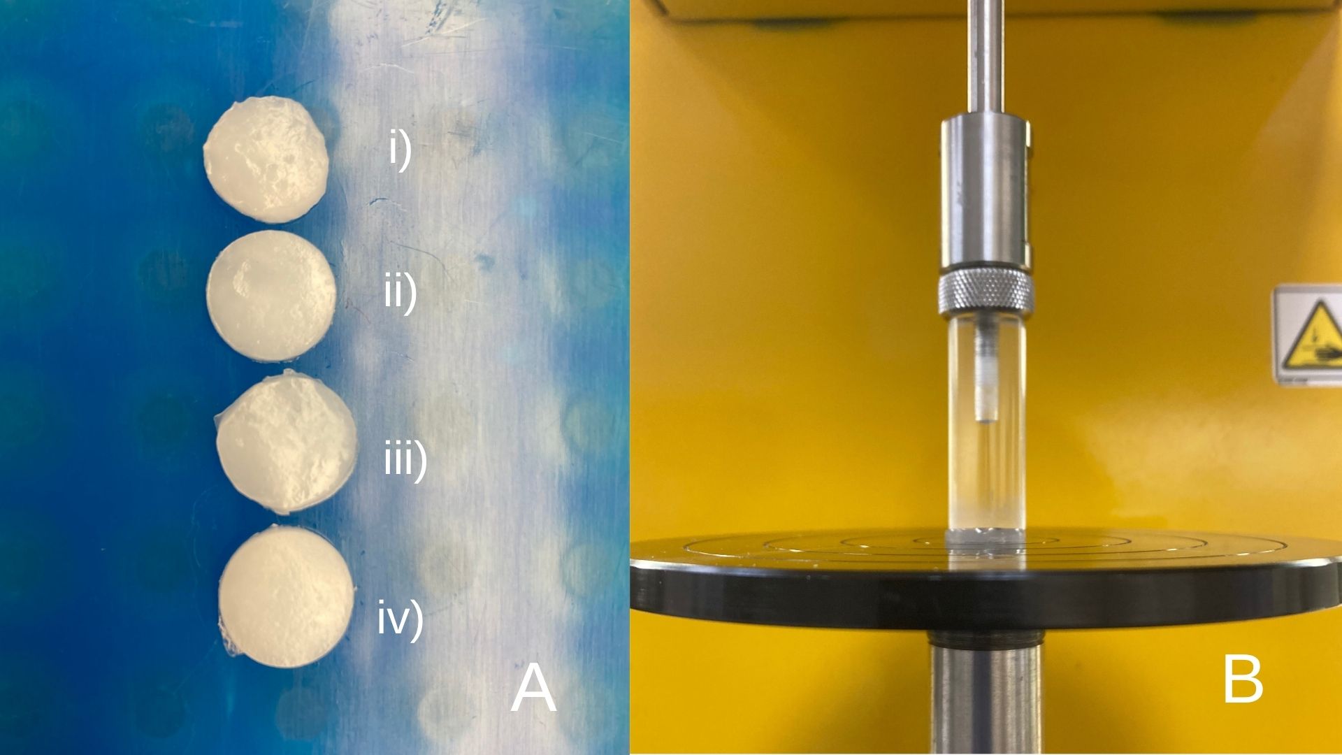 Figure 1. Showing the PVA cryogel formulations and mechanical properties test set-up using the texture analyzer (TA) CT3-1000 (Brookfield, MA, USA). (A) i) 5% PVA Cryogel (unloaded) ii) 10% PVA Cryogel (unloaded) iii) 5% PVA Cryogel + 125mg Dextromethorphan Hydrobromide iv) 10% PVA Cryogel + 125mg Dextromethorphan Hydrobromide. (B) Represents PVA Cryogel on TA plate being assessed.