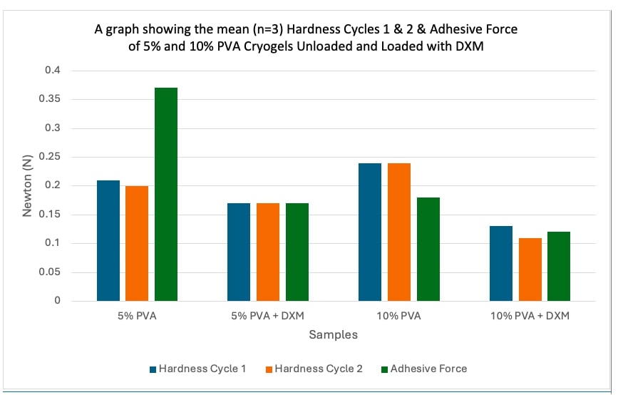 A graph showing the mean (n=3) Hardness Cycles 1 & 2 & Adhesive Force of 5% and 10% PVA Cryogels Unloaded and Loaded with DXM
