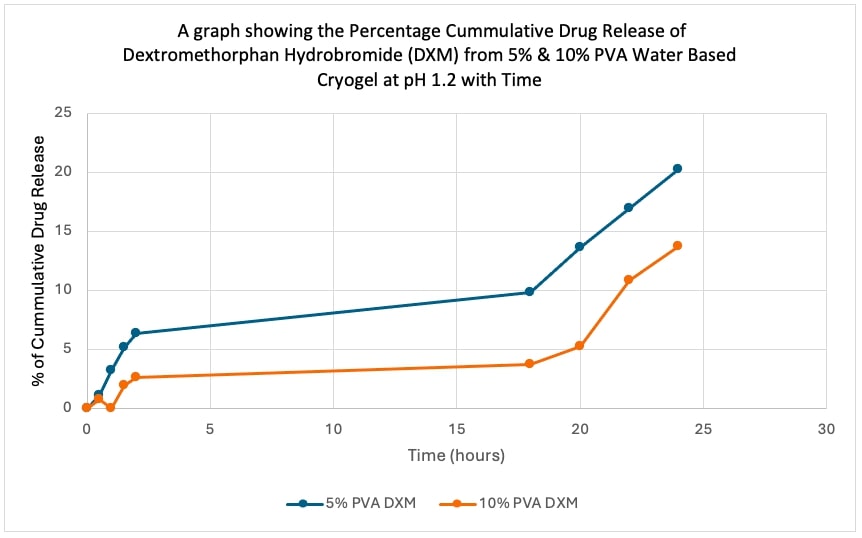 A graph showing the mean ± SD (n=3) hardness cycles 1 & 2 of 5% and 10% PVA cryogels unloaded and loaded with DXM.