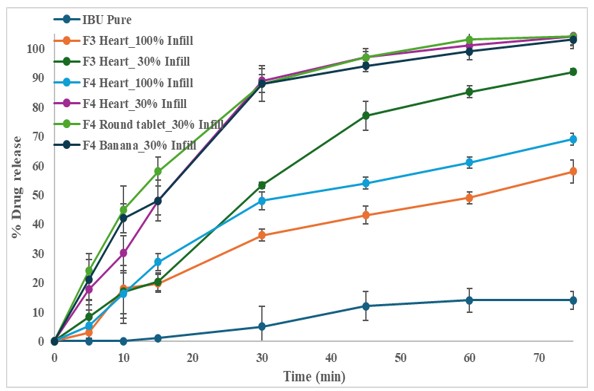 Dissolution profiles of IbuPure vs. F3 100% & 30% infill vs. F4 100% and 30% infills of heart-, round-, and banana-shaped tablet