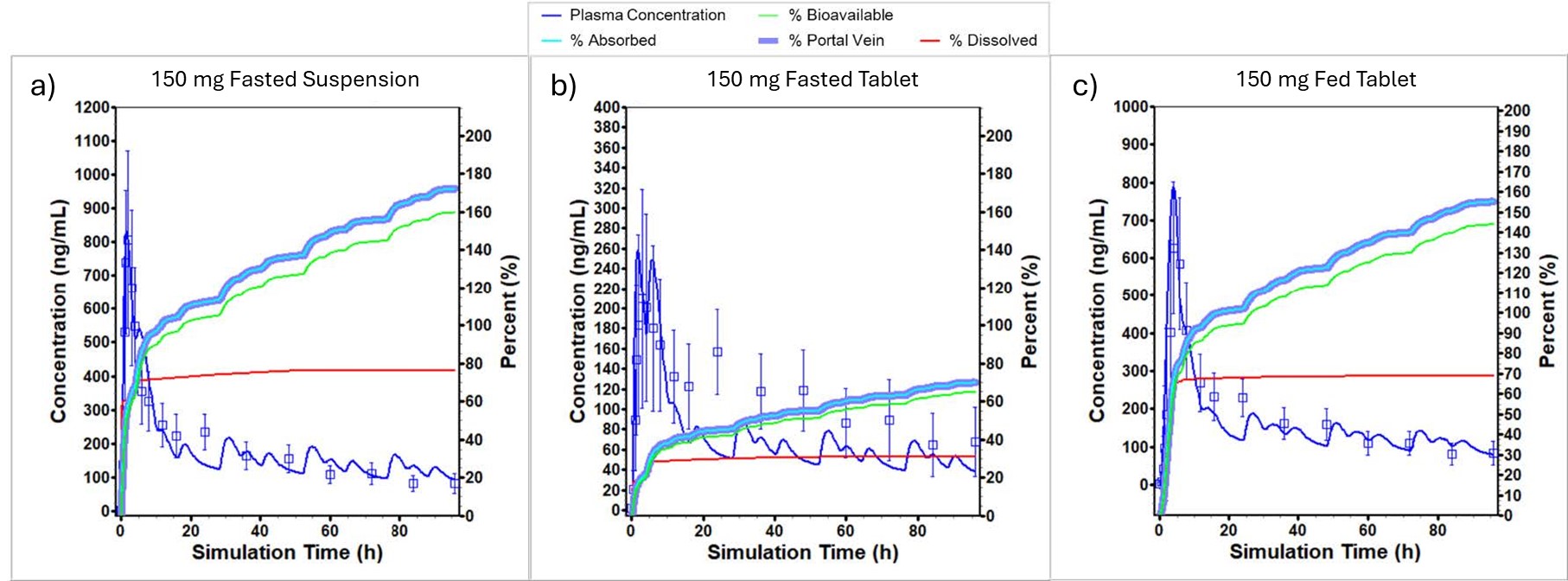 Figure 1: Observed and Simulated Results of a) 150 mg Oral Suspension, b) Fasted 150 mg Tablet, and c) Fed 150 mg Tablet in Human Study.