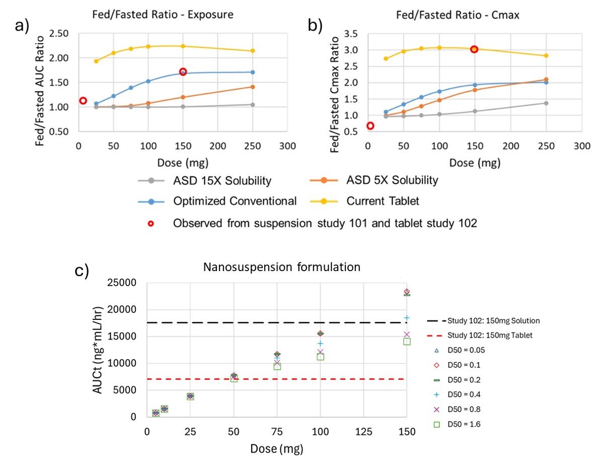 Figure 2: (a) Fed/Fasted Ratio of AUC to Dose and Formulation Type, (b) Fed/Fasted Ratio of Cmax to Dose and Formulation Type and (c) AUC vs Dose of Nanosuspension and API Formulations.
