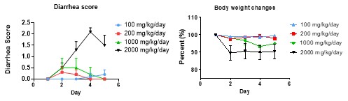 Figure 1: The diarrhea score was evaluated during the five days of treatment. Diarrhea incidence rose dose-dependently at 0.2% at 100 mg/kg, 0.3% at 200 mg/kg, 0.5% at 1000 mg/kg, and 2.1 % at 2000 mg/kg of GTO. The results are expressed as mean ± SEM (n = 10).