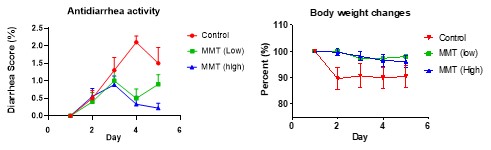 Figure 2: The diarrhea score was evaluated during the five days of treatment. Compared to the control group receiving glyceryl trioleate (GTO) alone (2000 mg/kg), clay co-administration at 2000 mg/kg reduced diarrhea scores, while the higher dose of clay co-administration at 4000 mg/kg achieved a significant diarrhea attenuation. The results are expressed as mean ± SEM (n = 10).