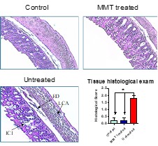 Figure 3: Colon tissue histological exam. Histological sections were stained with HE and observed under a microscope for tissue damage. The control group was treated with vehicle only, the untreated group was administered GTO (2000 mg/kg/day, p.o.); the MMT-treated group was co-treated with GTO (2000 mg/kg/day, p.o.) + MMT (4000mg/kg/day, p.o.). The control group showed normal villi, crypts, and a muscular layer. The untreated group showed inflammatory cell infiltration (ICI), loss of normal crypt architecture (LCA), and oedema (ED). The MMT-treated group showed restored architecture and reversed the effect of clay damage. Histological score results are expressed as mean ± SEM (n=5). *p < 0.05 (t-test).