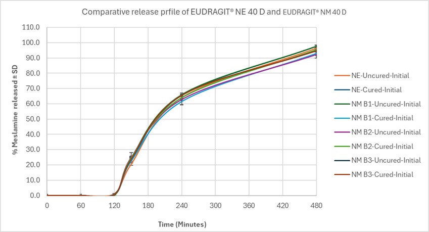 Comparative dissolution profile of EUDRAGIT® NE 40 D and EUDRAGIT® NM 40 D: Effect of curing and reproducibility of EUDRAGIT® NM 40 D based mesalamine matrix granules