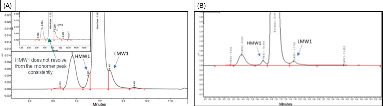 Figure 1: SEC Assay: In Legacy method HMW1 merges to the monomer peak or resolves in the monomer shoulder (run to run variation). New method consistently resolves HMW1 from the monomer peak.