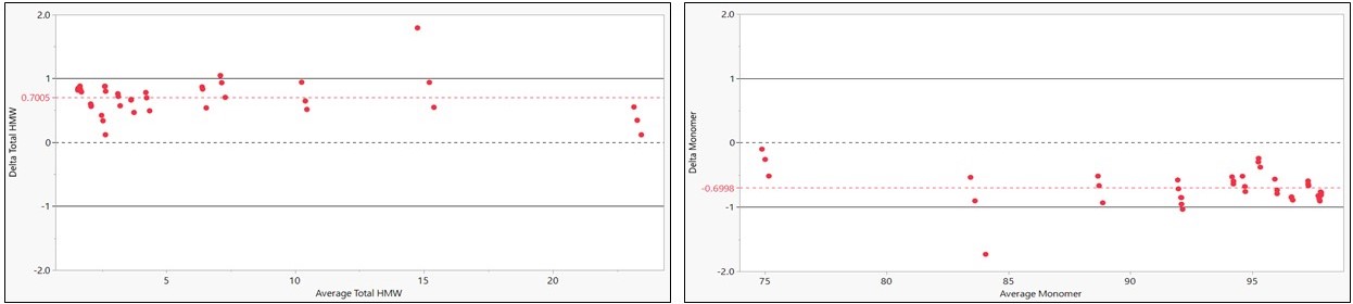 Figure 2 and 3: SEC Bridging: There is an offset of 0.7 for %HMWS and -0.7 for %Monomer.