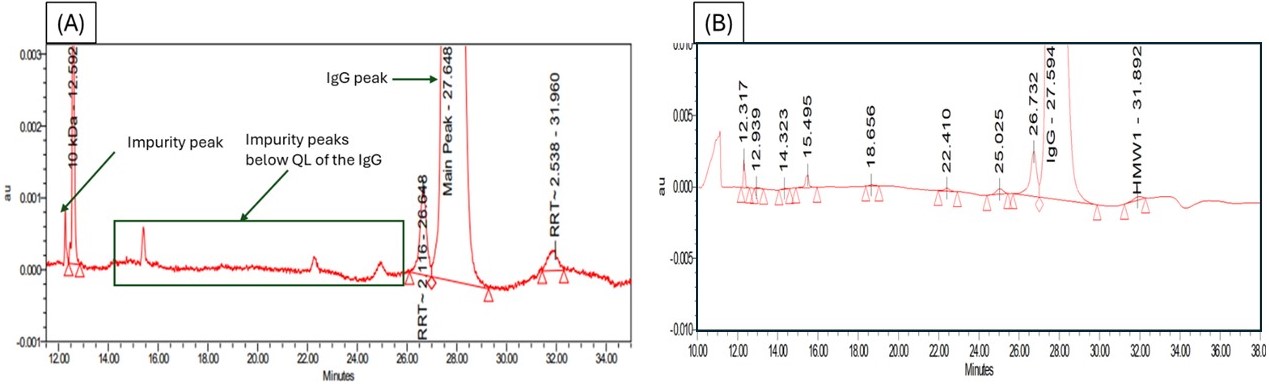 Figure 4:: CE-SDS Assay: (A) Legacy method tends to underestimate the impurities by not quantifying the impurity peaks which either co-resolve with the 10 kDa standard or which are below QL of the main peak. (B) New method consistently quantitates all impurity peaks.