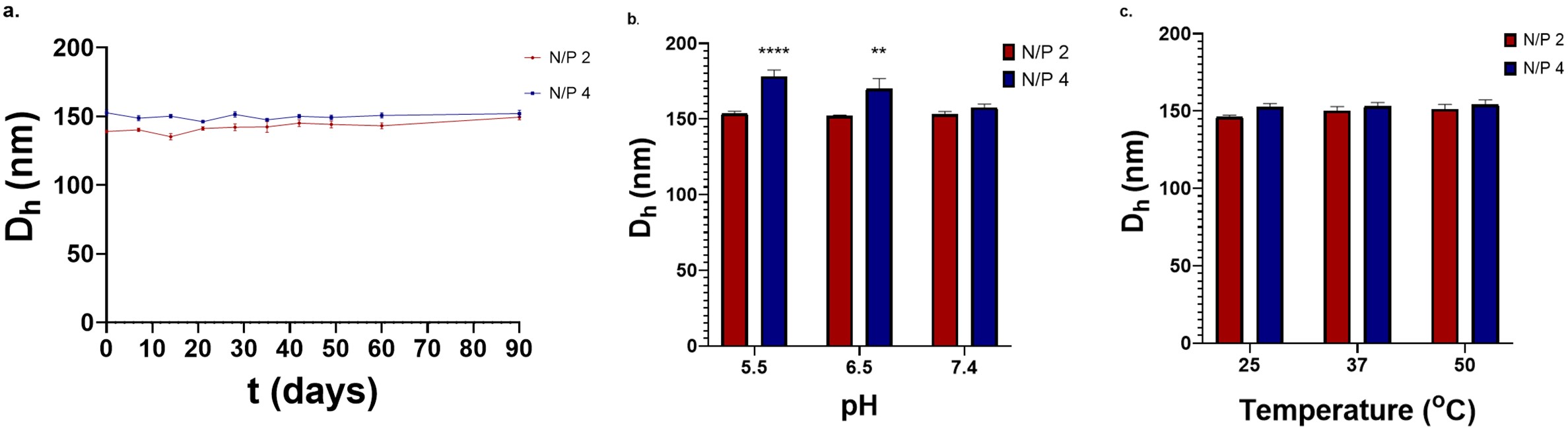 Figure 1. The hydrodynamic diameter (Dh) of lyotropic liquid crystalline nanoparticles (LLCNPs) encapsulating DNA at N/P 2 and N/P 4 ratios a) over 90 days of storage, b) upon incubation in various pH conditions, and c) after incubation at different temperatures.
