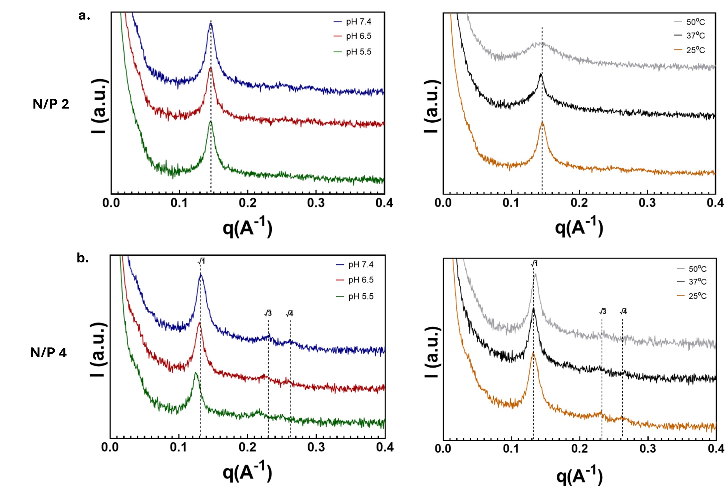 Figure 2. SAXS patterns of lyotropic liquid crystalline nanoparticles (LLCNPs) encapsulating DNA at a) N/P 2 and b) N/P 4 ratios over a pH range from 5.5 to 7.4, and a temperature range from 25 °C to 50 °C.