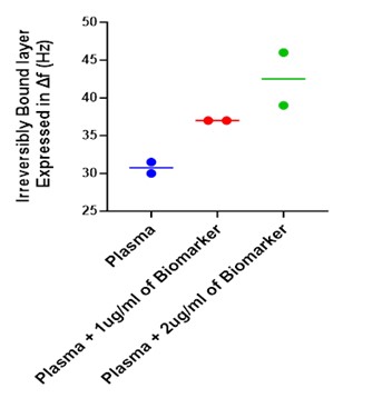 Figure 3. Frequency shifts recorded for rat plasma samples spiked with known concentrations of the biomarker.