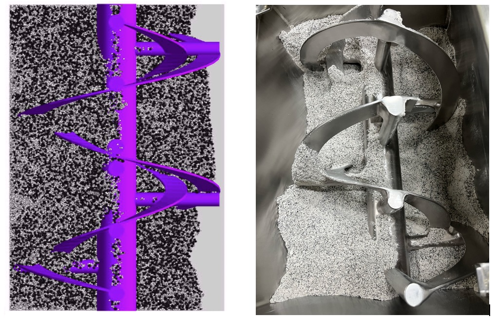 Comparison of blend homogeneity at 75 revolutions: DEM (left), experimental (right)
