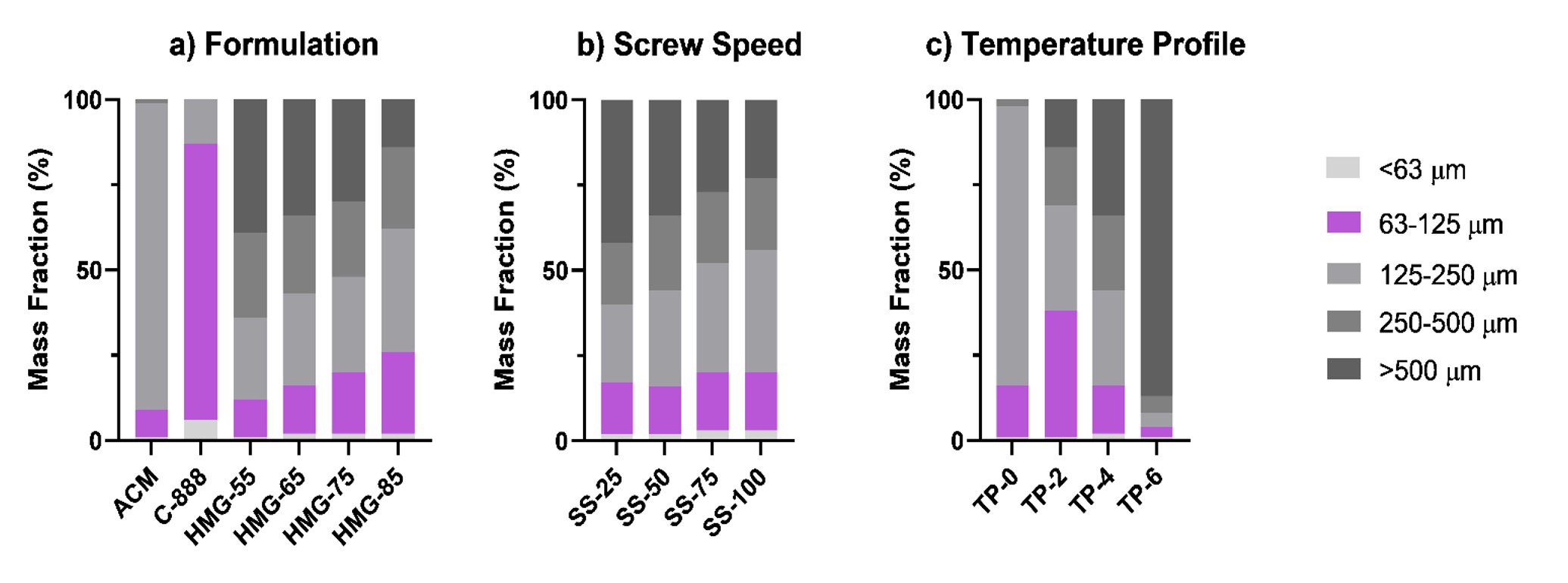 Figure 1. Mass fraction (%w/w) of hot-melt granules as a function of a) formulation ratios, b) screw speed, and c) extruder temperature profiles.