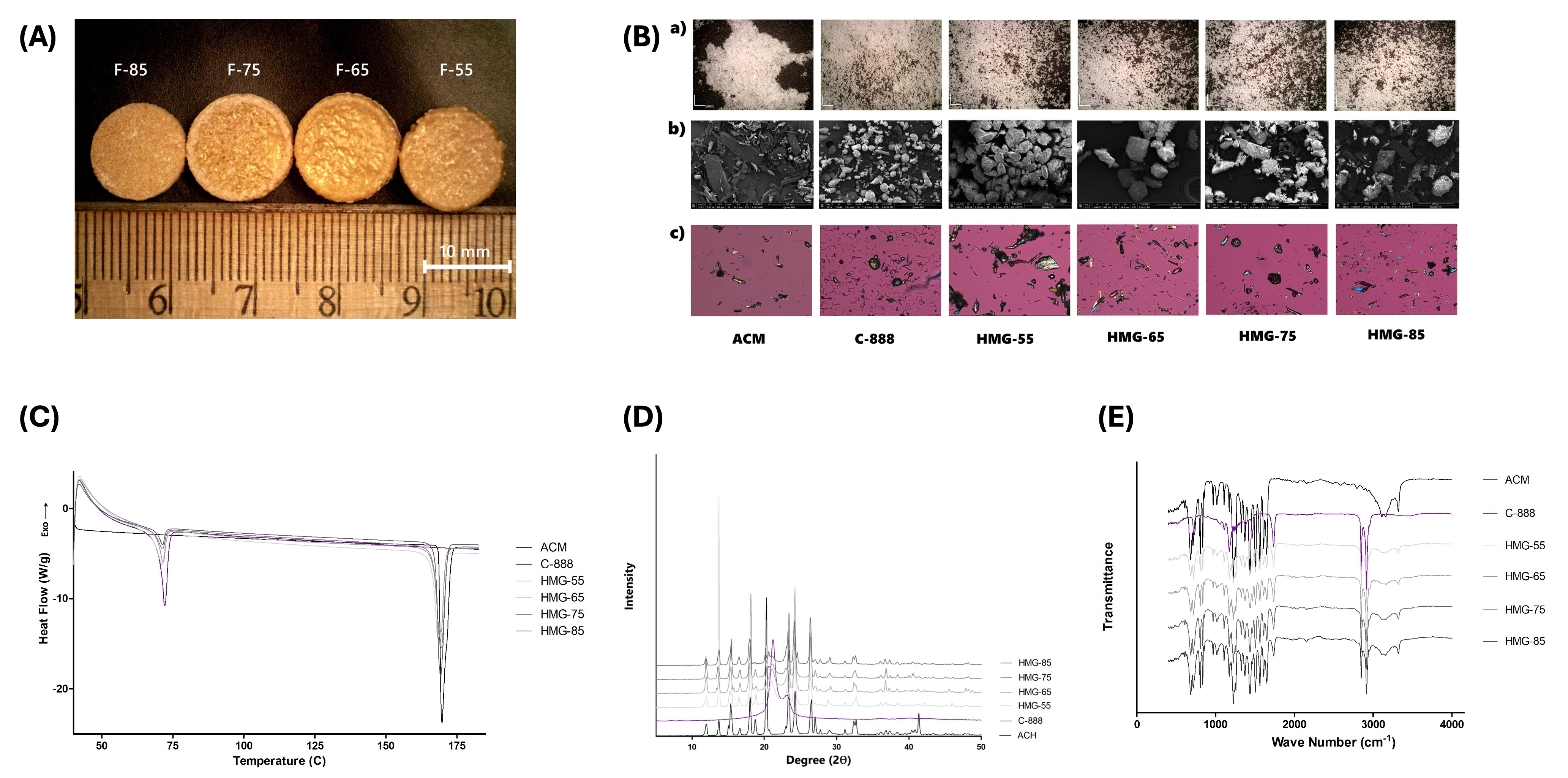 Figure 2: A) Digital light microscopic images of the SLM 3D-printed tablets with varying drug load; B) Digital light microscopic, scanning electron microscopy (SEM), and polarized light microscopy (PLM) images; C) differential scanning calorimetry; D) powder X-ray diffraction; and E) FT-IR spectra of the drug (ACM), lipid (C-888), and HMG granules from four different formulations denoted as HMG-55, HMG-65, HMG-75, and HMG-85 based on the 55-85% (w/w) drug load.