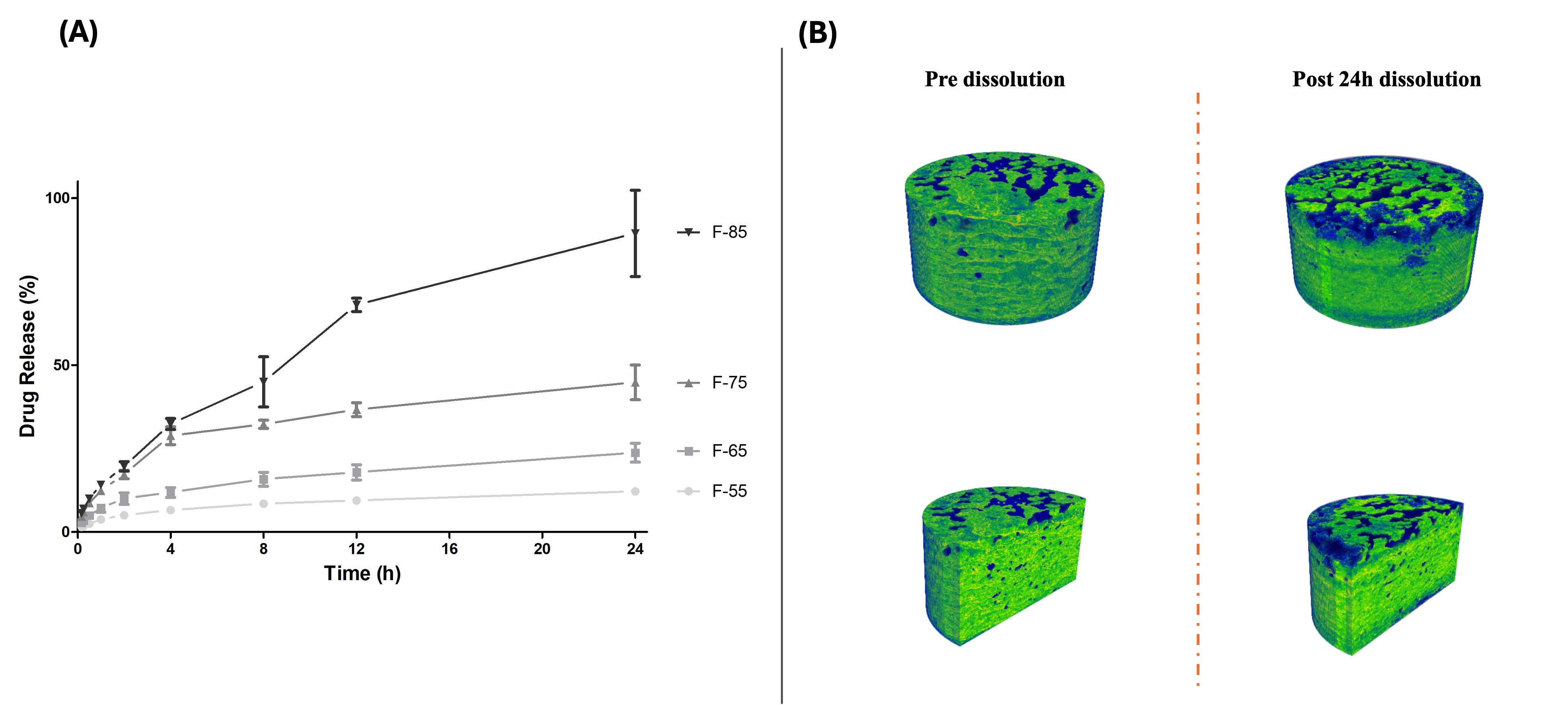 Figure 3: A) In vitro drug release profile of the SLM 3D-printed tablets from various formulations with varying drug loads (55–85% w/w); B) X-ray micro-CT images showing the top surface and inner pores of the SLM 3D-printed tablet (F-65 formulation) pre- and post-24 hours of dissolution study.