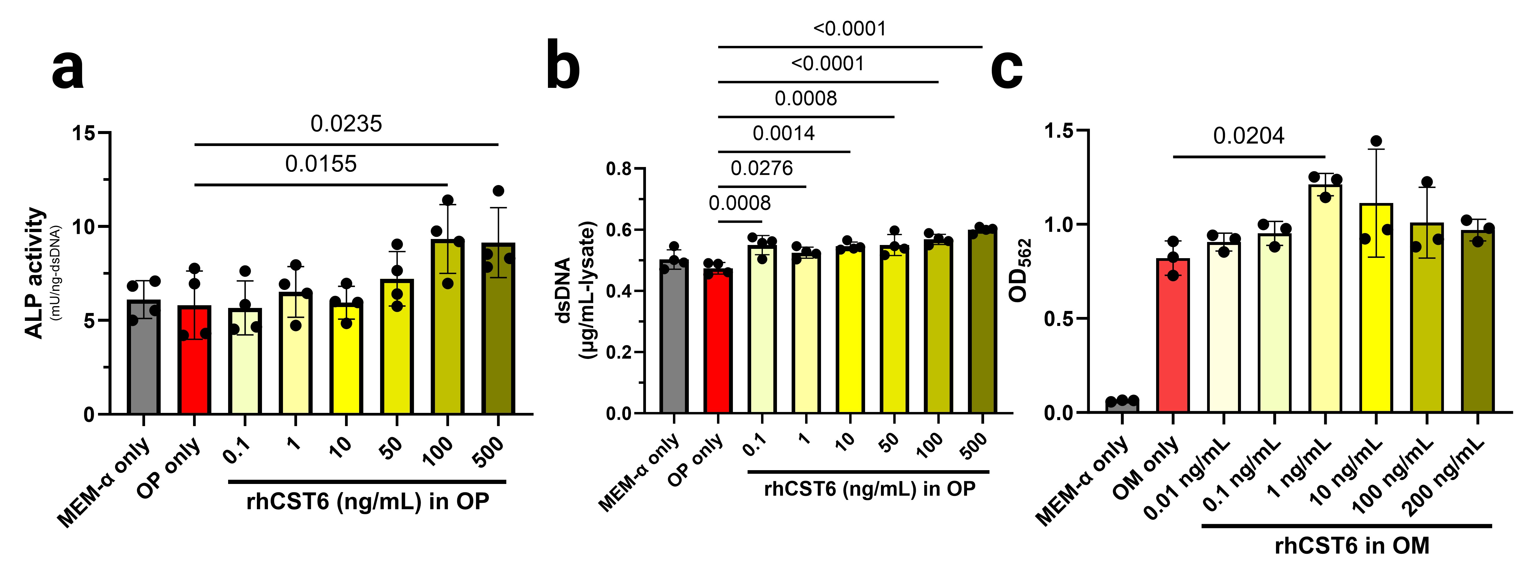 Figure 1: In vitro osteogenic and mineralization effects of rhCST6 protein in hBMSCs and MC3T3-E1 (subclone 4) cells in presence of osteo-permissive or osteogenic media. (a) alkaline phosphatase activity assay of hBMSC cell lysates with normalization to the total dsDNA content in the lysate (after 7 days of culture). (b) total dsDNA contents in the hBMSC cell lysates (after 7 days of culture). (c) semi-quantification of alizarin red S staining of the MC3T3-E1 cell monolayers with/without rhCST6 protein (after 7 days of culture). The alizarin red S-stained deposits were extracted using acetic acid and subsequently neutralized using ammonium hydroxide before absorbance measurements. MEM-α = complete MEM-α supplemented with 10% fetal bovine serum, 100 U/mL PenStrep, and 4 mM GlutaMAX™; OP = osteo-permissive medium; OM = osteogenic medium. OP and OM were of the same composition, which was the complete MEM-α supplemented with 10 mM β-glycerophosphate and 50 µg/mL magnesium ascorbyl phosphate. Statistical analysis was performed using ordinary one-way ANOVA followed by Dunnett’s tests versus the OP (or the OM) only group at the significance level of 0.05.