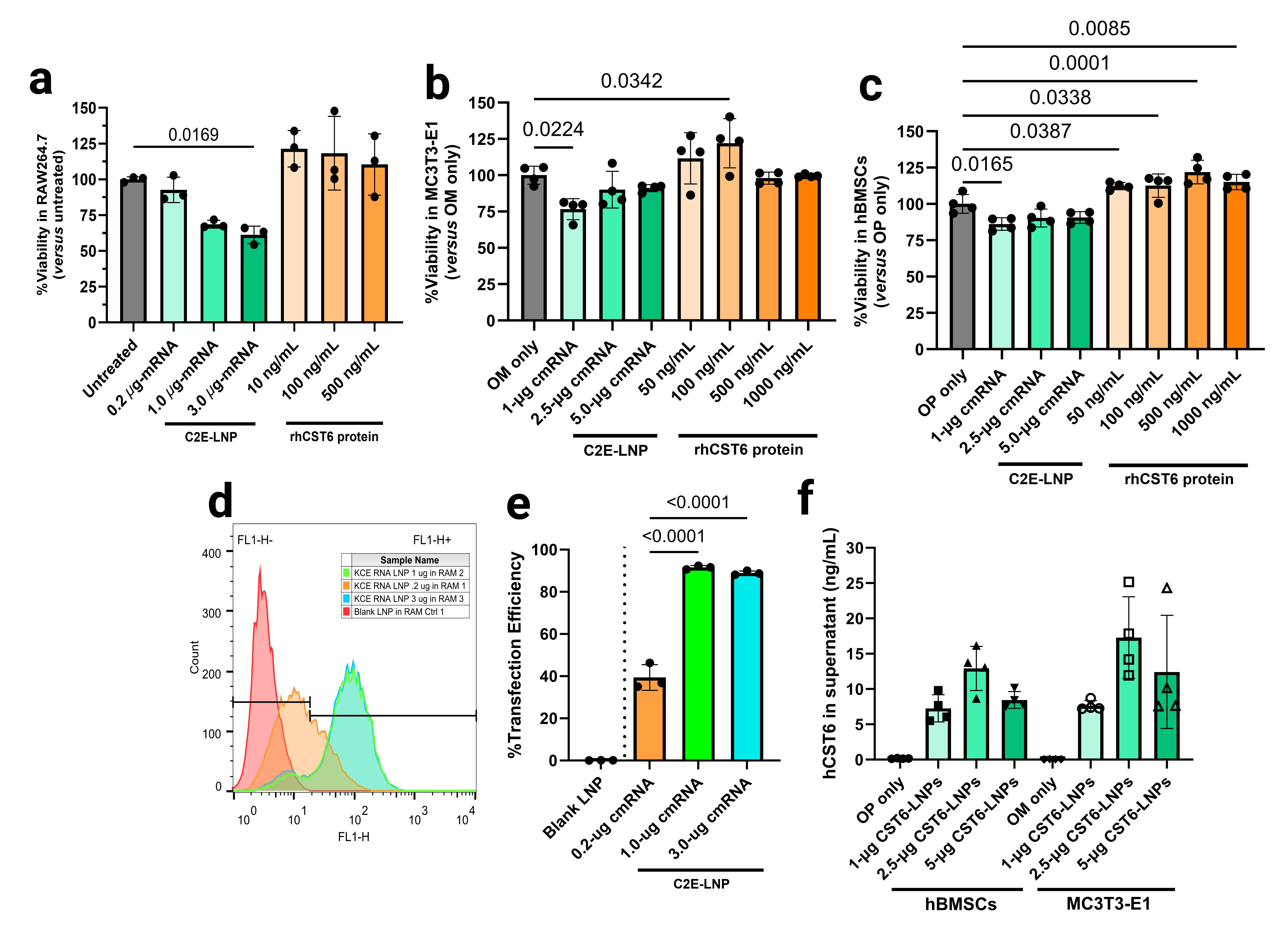 Figure 2: Cell viability, %transfection, and secreted hCST6 levels at 24 hours after hCST6-P2A-eGFP-coding cmRNA delivery (as lipid nanoparticles) in various cell types. MTS assays show minimal cytotoxicity in (a) RAW264.7 cells, (b) MC3T3-E1 subclone 4, and (c) hBMSCs. (d) & (e) Flow cytometry results show dose-dependent increases in transfection efficiencies. (f) ELISA results showing that CST6-LNPs delivery successfully induced expression and secretion of hCST6 protein in hBMSCs and MC3T3-E1 subclone 4 cells. OP = osteo-permissive medium; OM = osteogenic medium. OP and OM were of the same composition, which was MEM-α supplemented with 10% fetal bovine serum, 100 U/mL PenStrep, and 4 mM GlutaMAX™ with 10 mM β-glycerophosphate and 50 µg/mL magnesium ascorbyl phosphate. For (a), (b), and (c), statistical analysis was performed using ordinary one-way ANOVA followed by Dunnett’s tests versus the medium only group (i.e., untreated, OM only, or OP only) at the significance level of 0.05. For (e) and (f), statistical analysis was performed using ordinary one-way ANOVA followed by Tukey’s tests (with exclusion of background control groups, namely Blank LNP, OP only, and OM only) at the significance level of 0.05.