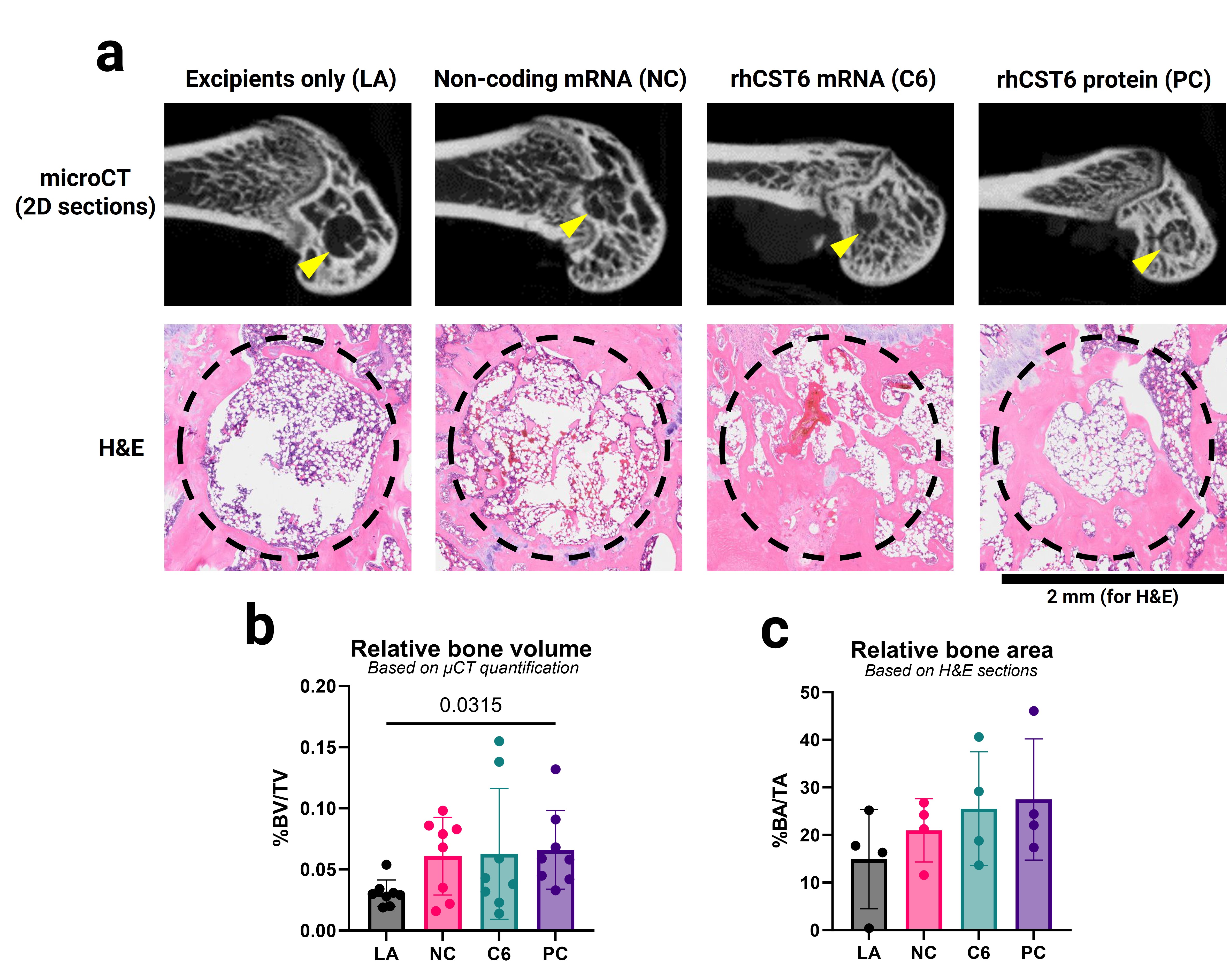 Figure 3: In vivo bone regeneration in the rat femoral metaphysis drill defect model. (a) representative 2D radiographs and H&E sections from each treatment group. Relative bone volumes and relative bone areas were quantified based on (b) micro-CT image reconstruction (n = 8 per treatment group) and based on (c) H&E sections (using ImageJ; n = 4 per treatment group). LA = collagen plug lyophilized with the buffer/cryoprotectant mix only (8%w/v sucrose in 5-mM Tris-HCl, pH 8); NC = collagen plug lyophilized with LNPs loaded with non-coding cmRNA in the buffer/cryoprotectant mix (CST6 sequence with scrambled Kozak sequence and in-frame stop codons); C6 = collagen plug lyophilized with LNPs loaded with CST6-coding cmRNA in the buffer/cryoprotectant mix; and PC = rhCST6 protein lyophilized in PBS, pH 7.4 (similar to the lyophilized product as supplied by the manufacturer of rhCST6 protein). NC and C6 were given as a 25 µg-RNA dose per defect; PC was given as a 15 µg-protein per defect; LA was loaded with the same volume of the buffer/cryoprotectant mix as NC and C6 prior to lyophilization. Collagen plug dimensions prior to lyophilization were 2.0 mm in diameter and 5.0 mm in length. The drill defect dimensions prior to implantation were 2.0 mm in diameter and 4.0 mm in depth. Statistical analysis was performed using ordinary one-way ANOVA followed by Dunnett’s tests versus the LA group at the significance level of 0.05.