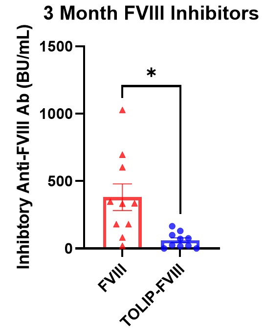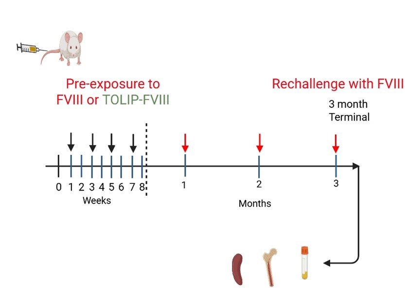 Figure 1: IV dosing strategy in HA Mice. Mice were injected with free FVIII or TOLIP-FVIII once every 2 weeks for 8 weeks. Following prophylactic dosing, mice were dosed with free FVIII subcutaneously once a month for 2 months then twice on month 3. Mice were sacrificed at 3 months and plasma, spleen, and bone marrow cells were collected.