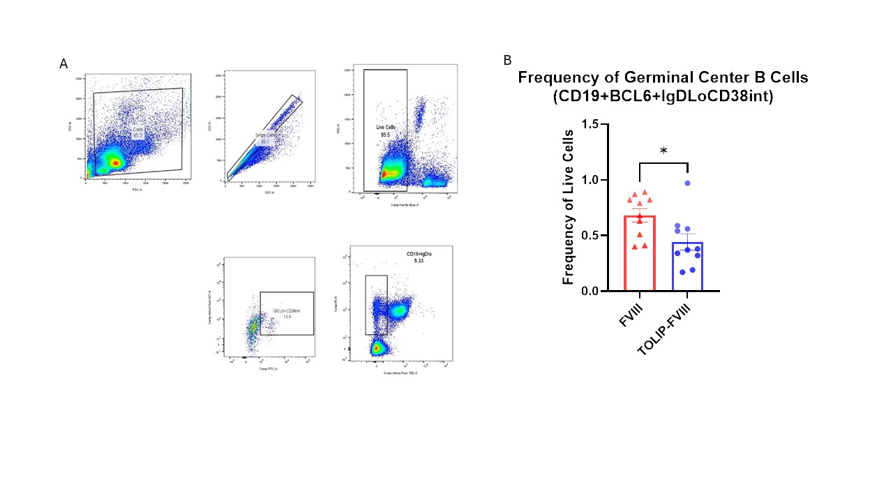 Figure 3: A) Flow Cytometry gating strategy for germinal center B cells (CD19+BCL6+IgDlowCD38int). B) Flow cytometry depicting frequency splenic germinal center B cells (CD19+BCL6+IgDlowCD38int) from CD19+IgDlow cells. Statistics were performed using two-sided Welch’s T test.