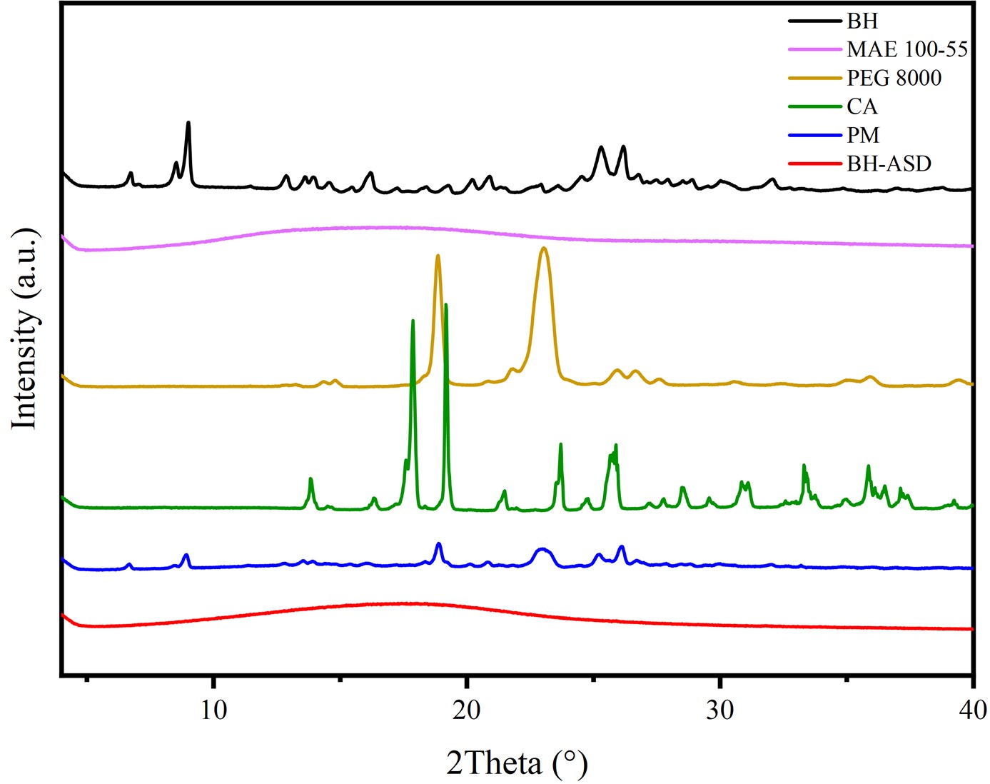 Figure 1. XRPD diffractograms of BH, MAE 100-55, PEG 8000, CA, physical mixture (PM), and BH-ASD.