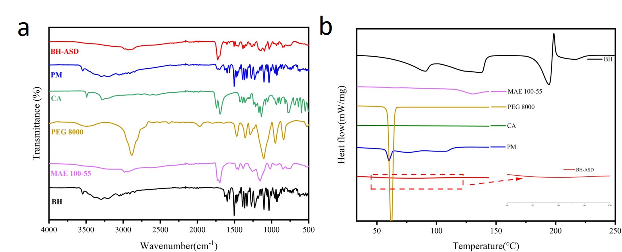 Figure 2. (a) FT-IR and (b) DSC of BH, MAE 100-55, PEG 8000, CA, PM, and BH-ASD.