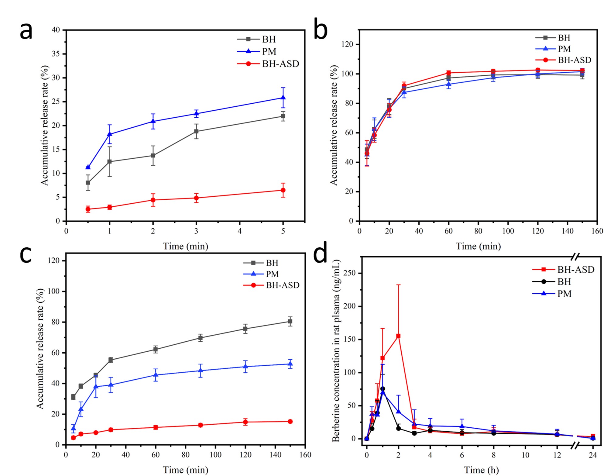 Figure 3. The dissolution curves of the BH, PM and BH-ASD in (a) the simulated salivary fluid (pH = 6.8, n = 3), (b) the simulated intestinal fluid (pH = 6.8, n = 3), (c) the simulated gastric fluid (pH = 1.2, n = 3) and (d) plasma concentration–time plots of original BER, PM and BH-ASD (n = 6).