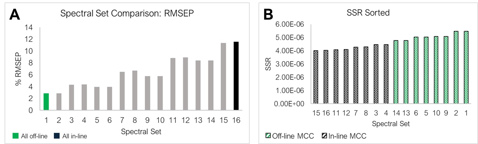 A-RMSEP trend across spectral sets, showing a gradual increase in prediction error as in-line pure components were added to the IOT input. B-SSR trend labeled by MCC collection condition, showing the effect of the nonchemical variance captured in the in-line environment.