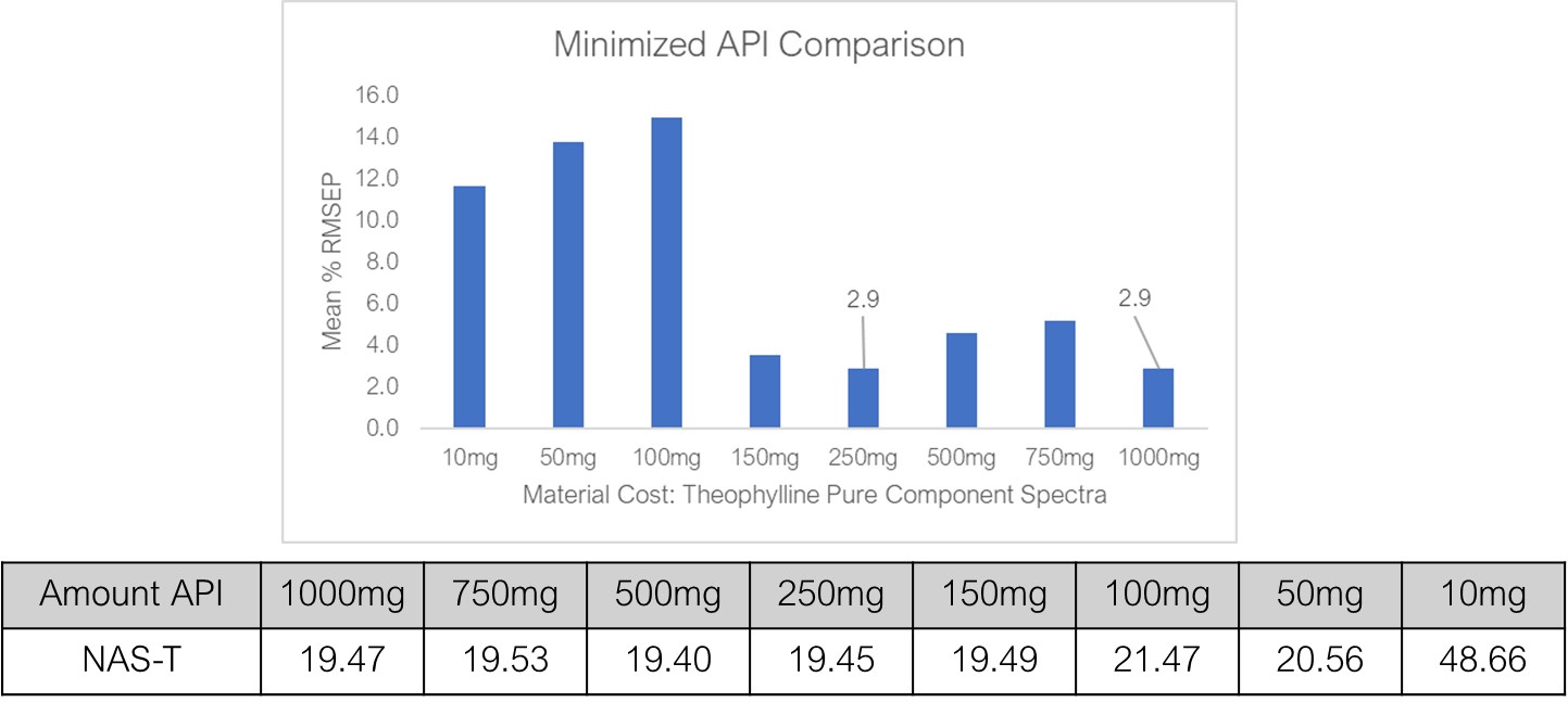 Chart shows the RMSEP when the API spectrum collected with the designated amount of material was used, showing the comparability between the 1000 mg and 250 mg predictions. The chart shows the NAS-T values and confirms the reliability of the predictions.