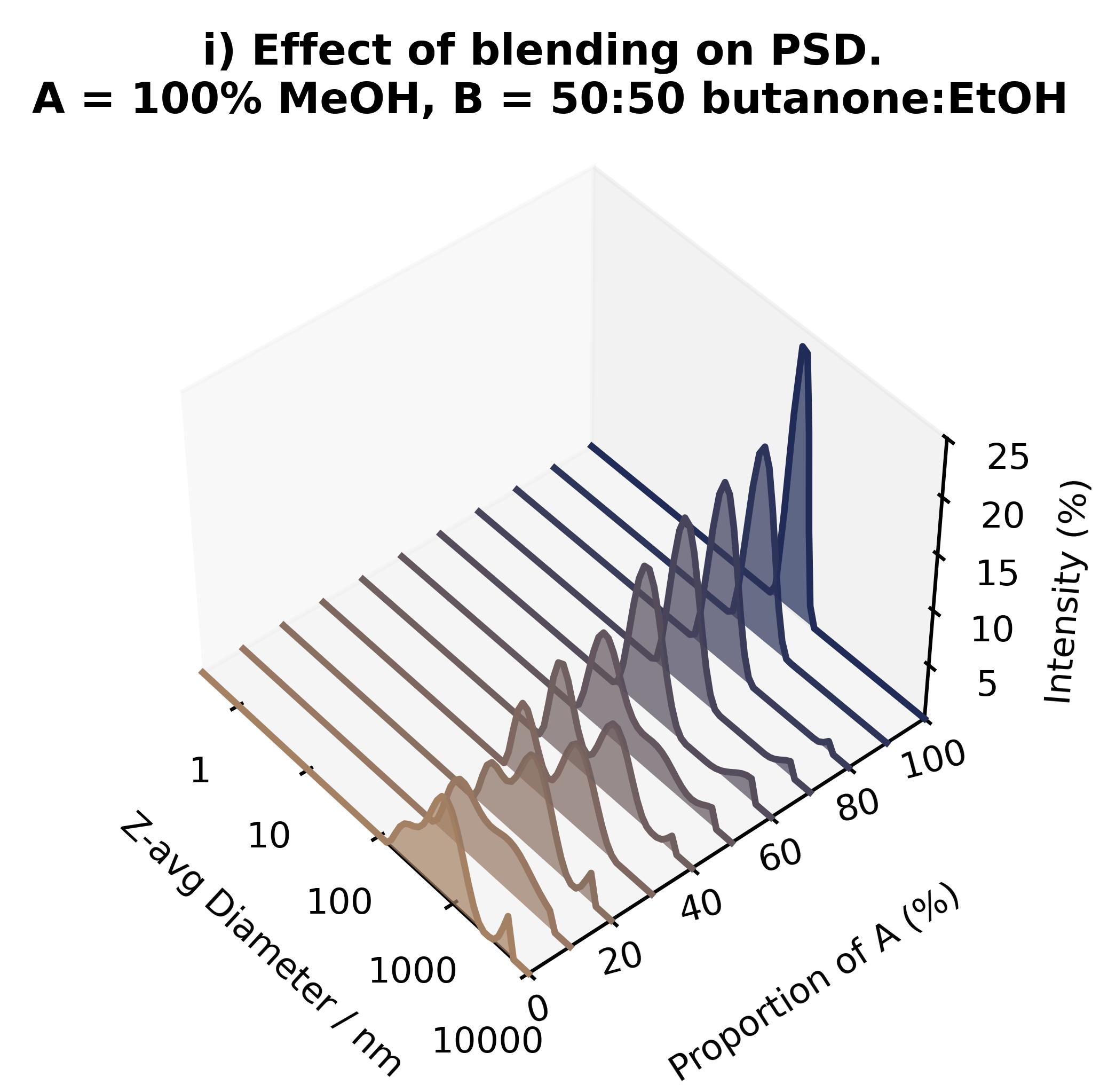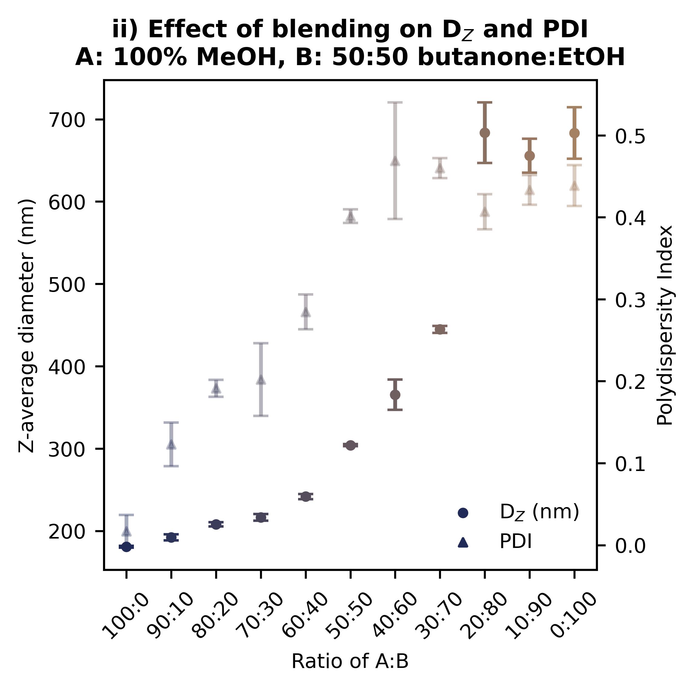 Z-average diameter (Dz, circles) and polydispersity index (PDI, triangles) RFP SDNs precipitated from A) 100% MeOH and B) 1:1 butanone/ethanol prepared as blends of differing ratios of A:B.