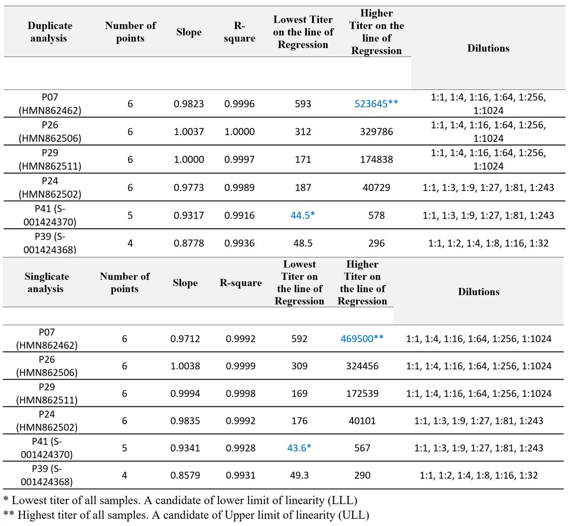Table 1: Summary of Linearity of anti-Antigen IgA with duplicate analysis and singlicate analysis