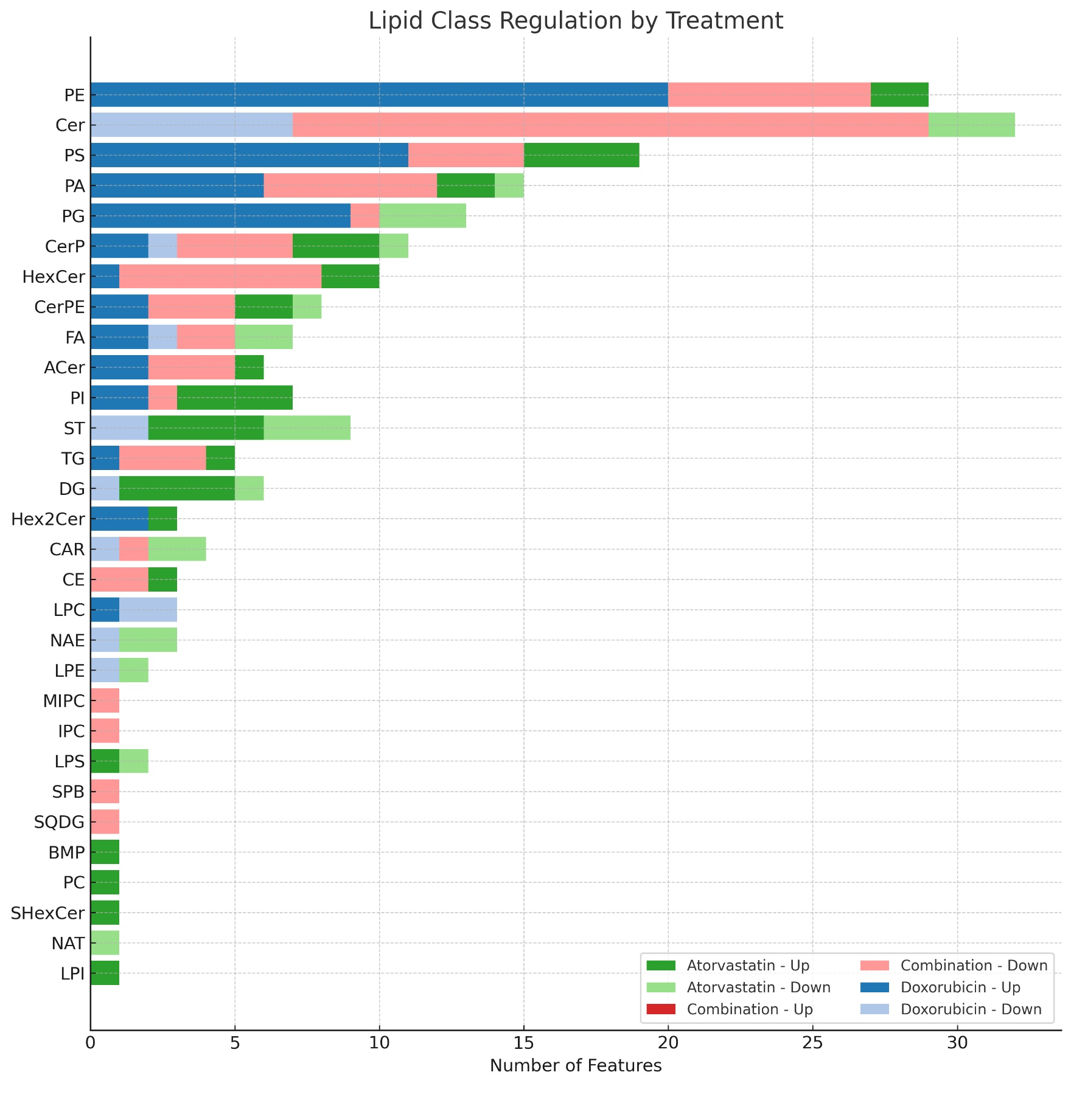 Figure 1. Horizontal bar chart showing the number of upregulated and downregulated lipid features by class for each treatment group. Lipid classes are sorted by total number of altered features. Bars represent counts of features with fold change >1.1 (upregulated) or <0.9 (downregulated) following treatment with atorvastatin, doxorubicin, or their combination.