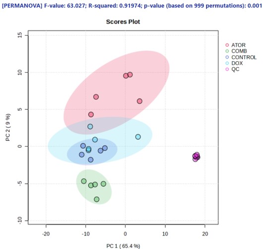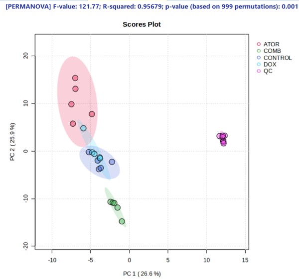 Figure 3. Principal Component Analysis (PCA) scores plot of lipidomic profiles (positive ion mode) from Huh-7 cells treated with atorvastatin (ATOR), doxorubicin (DOX), or their combination (COMB), alongside untreated controls and pooled quality control (QC) samples.
