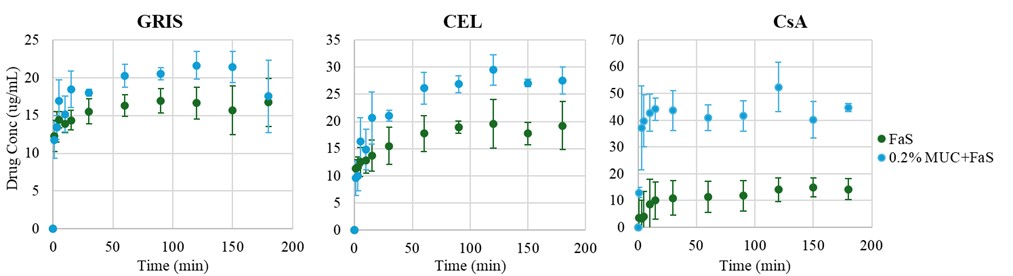 Figure 1: Drug Solubility in FaS with and without mucin.