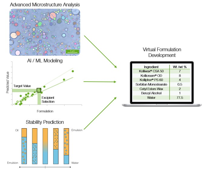 The proposed virtual workflow for properties-based formulation design. The workflow inputs quantitative microstructural and flow information on a reference listed drug, and predicts physical stability, droplet sizes, and other Q3 attributes of a user-specified 'virtual' formulation