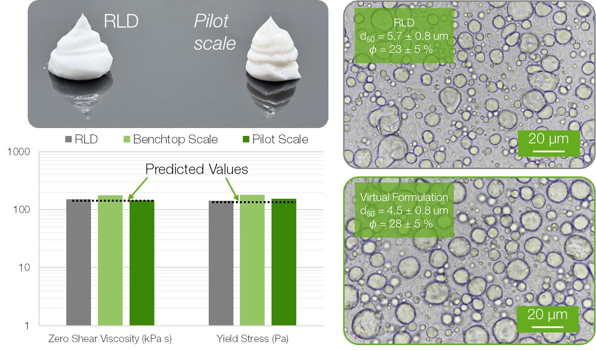 Visual, rheological, and microstructural characterization of the RLD and the candidate formulation identified through in-silico design, manufactured using both benchtop-scale and pilot-scale equipment. The dashed lines in the rheological comparison chart are the values predicted by our application of machine learning to an existing dataset of topical formulations. Both candidate formulations are similar to the RLD in each aspect.