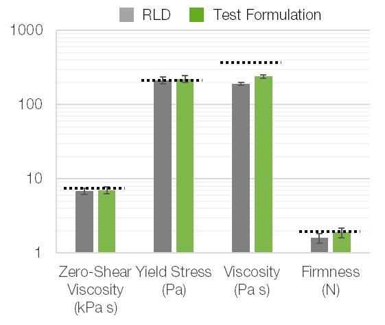 Extension of the machine-learning application to predict rheological attributes of other topical dosages forms. Here, a Poly(ethylene glycol) (PEG) ointment candidate formulation was benchmarked to a RLD containing the same excipients. The candidate formulation and RLD have identical properties within experimental uncertainty.