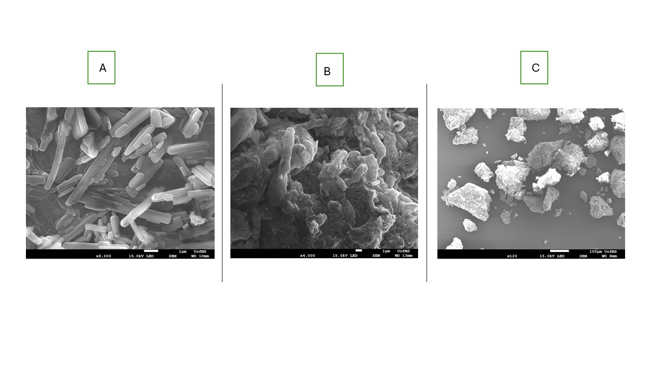 Figure 1: Scanning Electron Microscopy (SEM) images of (A) pure febuxostat crystals showing rod-shaped crystalline morphology, (B) liquisolid compact prepared by the conventional blending method demonstrating surface embedding of drug within the carrier matrix, and (C) liquisolid granules prepared via twin screw granulation revealing uniform, agglomerated granules with smoother morphology and enhanced surface dispersion.