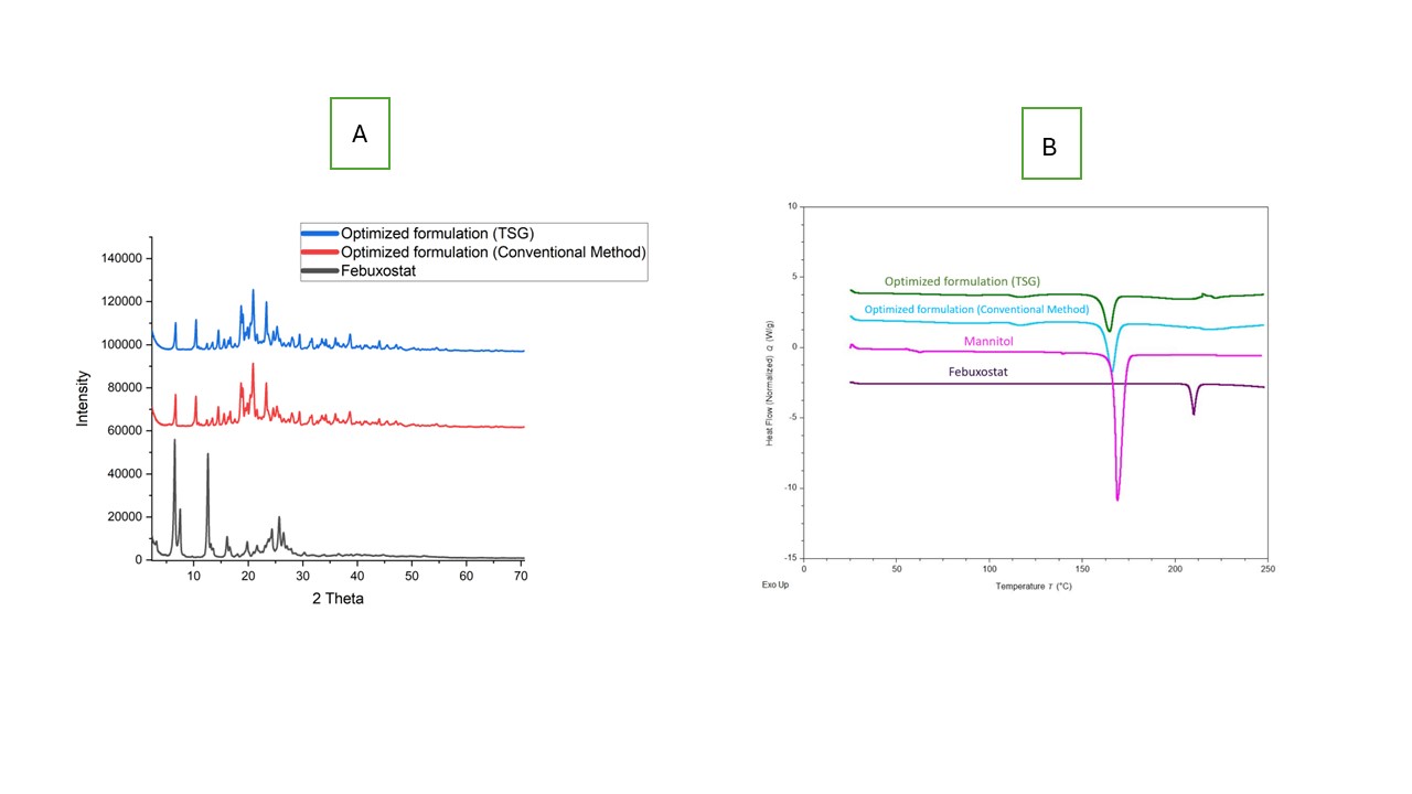 Figure 2: (A) Powder X-ray Diffraction (PXRD) patterns of pure Febuxostat, optimized formulation prepared via conventional blending, and Twin Screw Granulation (TSG) method. The sharp crystalline peaks of pure febuxostat diminished significantly in both formulations, indicating partial amorphization, with greater reduction observed in the TSG-based system. (B) Differential Scanning Calorimetry (DSC) thermograms of pure Febuxostat, Mannitol, and optimized formulations. The characteristic melting endotherm of febuxostat (~205°C) was reduced or absent in the formulations, confirming reduced crystallinity and potential molecular dispersion within the excipient matrix.