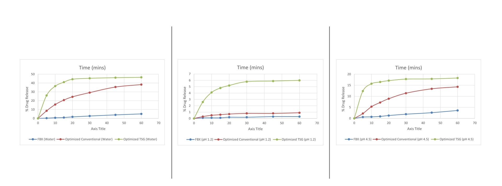 Figure 3: In vitro dissolution profiles of febuxostat, optimized conventional formulation, and optimized twin screw granulation (TSG) formulation in different media.