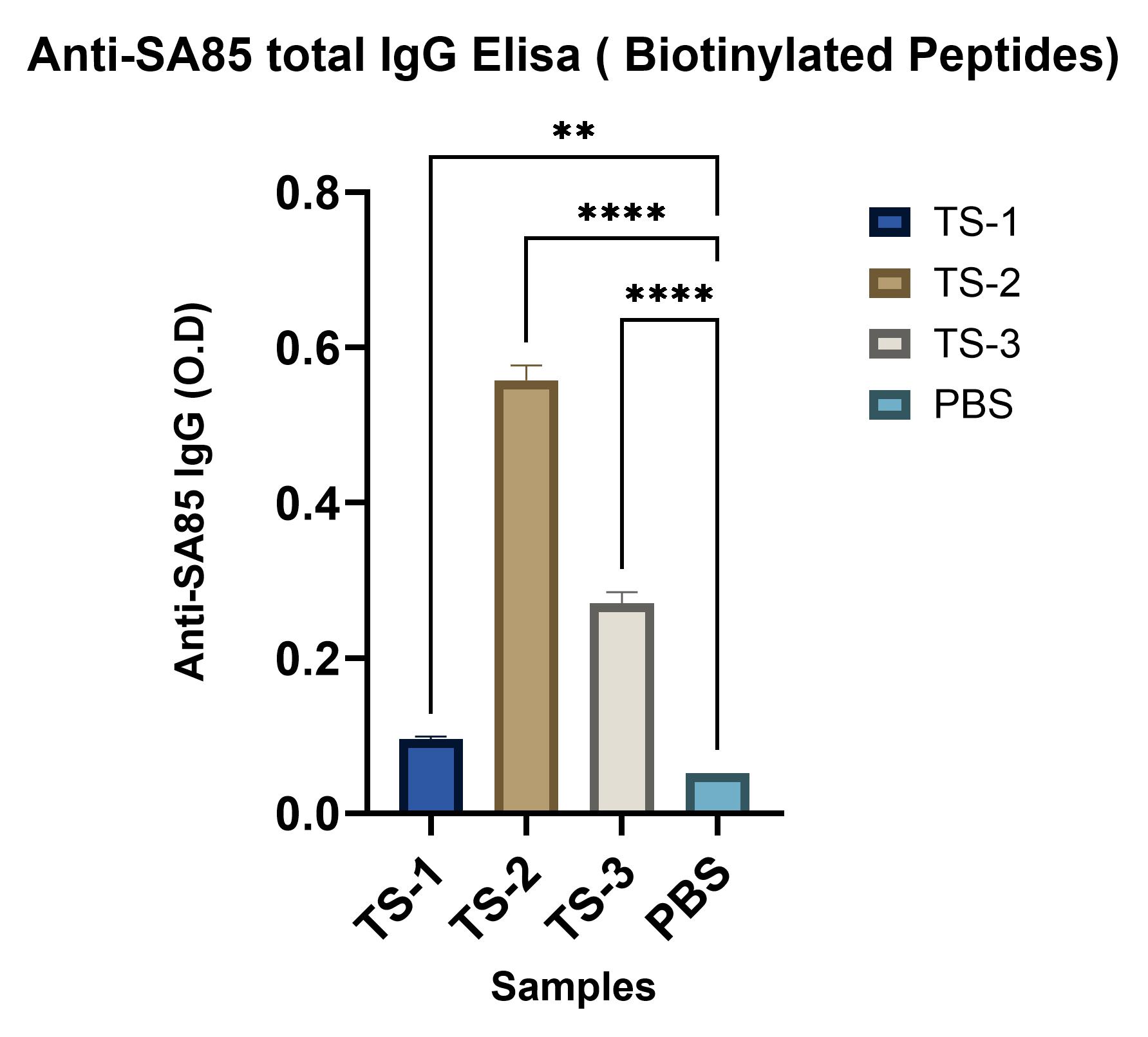 Anti-SA85 Total IgG by indirect ELISA using biotinylated SA-85 peptides and serum samples from immunised mice. One-way ANOVA comparison between Petides and PBS serum control. ** p<0.01, **** p<0.0001