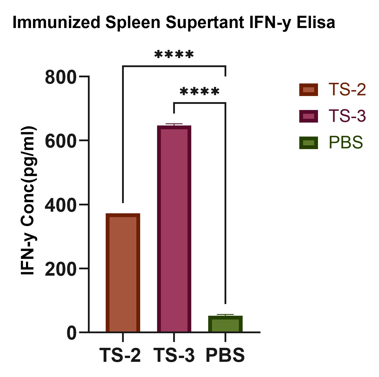 Spleen supernatant IFN-y cytokine profile. TS-2 (372.2 pg/ml), TS-3(647.2 pg/ml), PBS (52.61 pg/ml). One-way ANOVA comparison between Petides and PBS serum control. **** p<0.0001