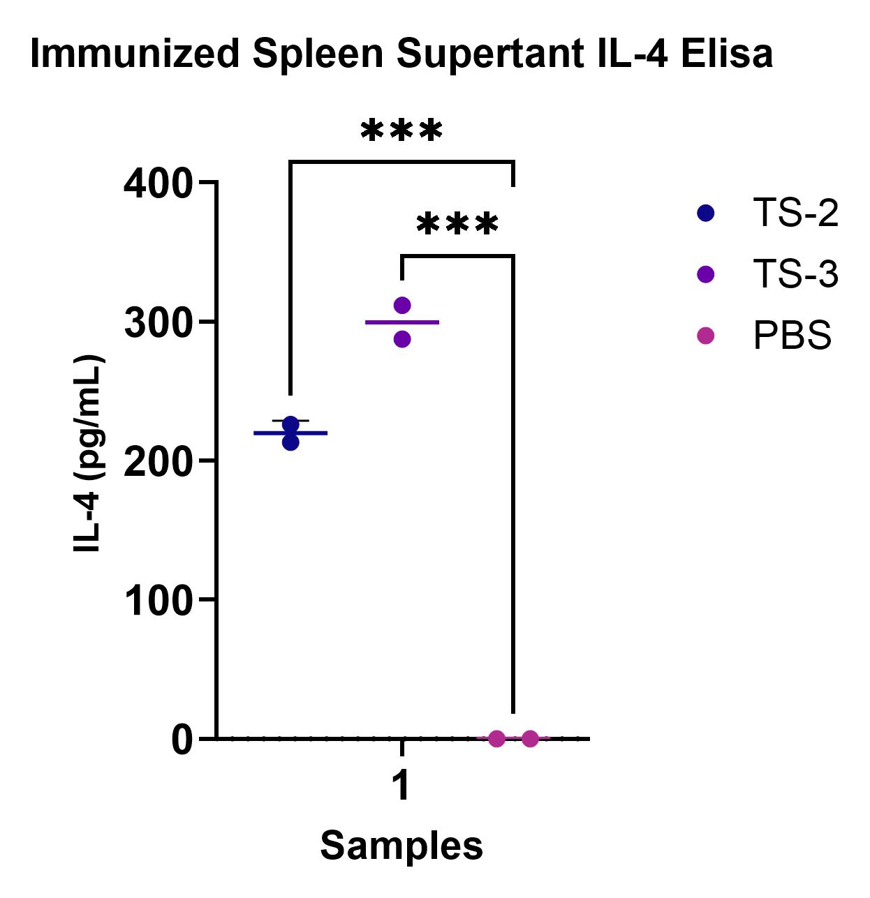 Spleen supernatant Il-4 cytokine profile.TS-2 (219.75 pg/ml), TS-3(299.5 pg/ml), PBS (0 pg/ml). One-way ANOVA comparison between Petides and PBS serum control. *** p<0.001